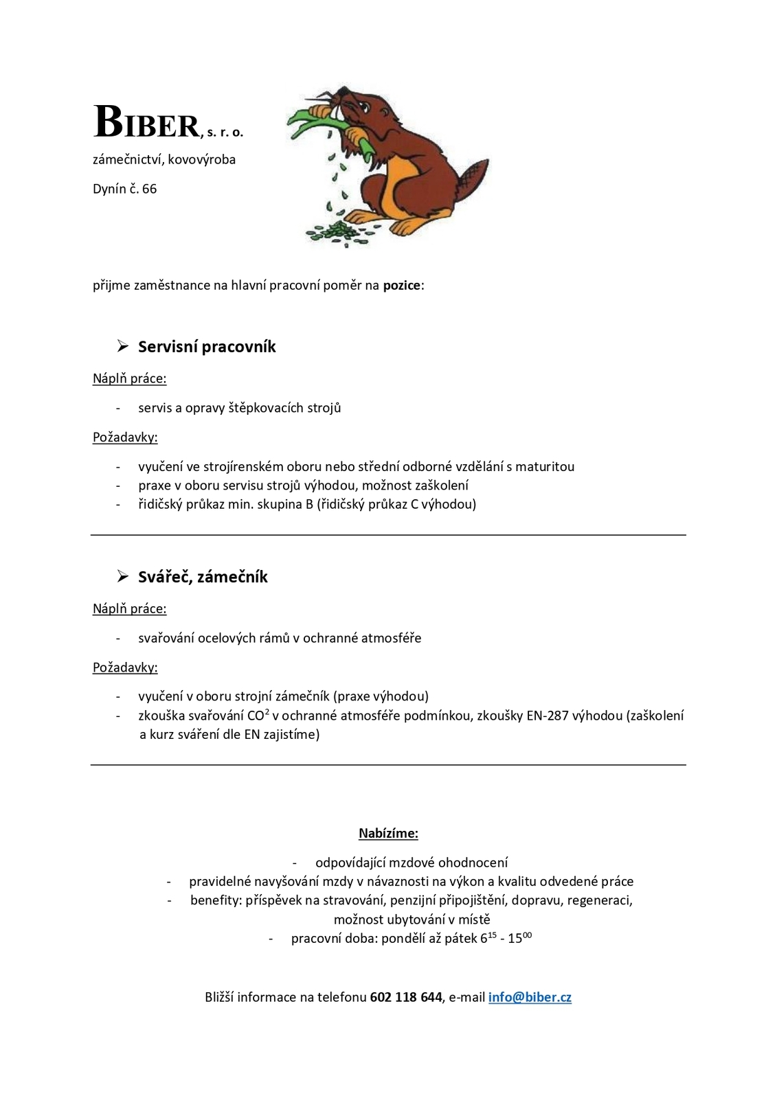 Úvodní stránka > Aktuality > Volné pracovní pozice Biber s.r.o. Dynín